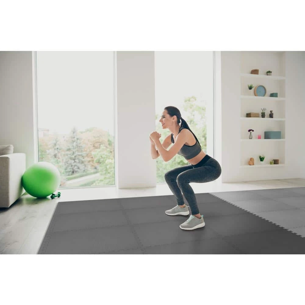 TrafficMaster Indoor Black/Gray Dual Sided Impact Foam Gym Floor Tiles feature a unique dual purpose sport flooring solution in one single product. One side features a durable surface for weights and exercise equipment. The softer opposing side is suitable for stretching, yoga, Pilates or general exercise requiring a softer cushioned surface. This product features a patented truly reversible design, allowing you to flip each individual gym floor tile over in order to suit the flexibility of your personal needs. They are offered in practical four-packs at an affordable price. This set Includes four truly reversible gray and black mats and eight straight edge borders to provide a finished, uniformed look. Each interlocking gym floor tile is 0.52 in. thick and measures 24 in. (L) by 24 in. (W) for a total coverage of 16 sq. ft. Made from the high quality materials, this design is an extremely flexible interlocking flooring solution. These gym floor tiles feature black coloring on one side and gray coloring on the opposing side. These foam gym floor tiles are extremely durable and can be installed similar to other puzzle mats or foam floor tiles with a variety of applications. TrafficMaster Dual Sided Impact Foam Gym Floor Tiles are flexible enough to be used in a variety of multi-purpose applications such as home gyms, utility rooms, basements as well as many commercial applications.