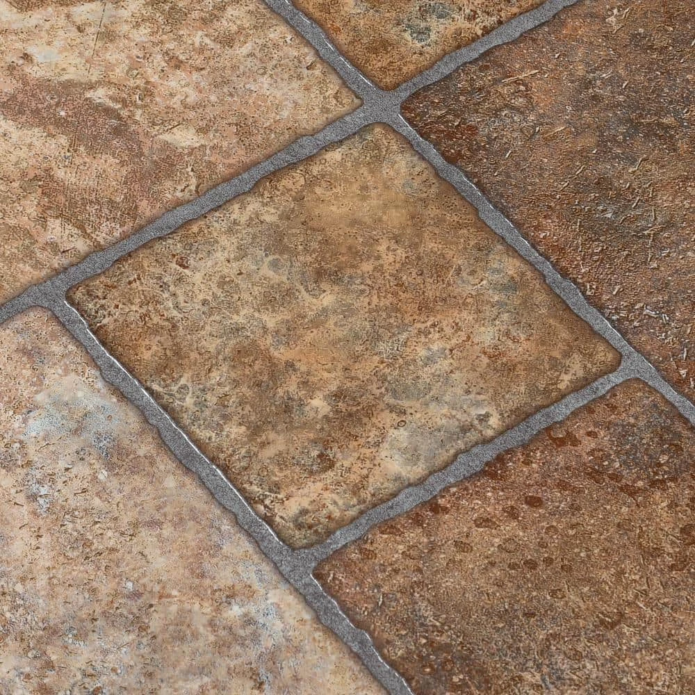 Give your floors an attractive makeover with the TrafficMaster Bodden Bay Terra Cotta Vinyl Tile. The random block stone design makes any room more stylish, and this tile is easy to install and maintain. It can be placed over wood or concrete subflooring and has a 30-year residential warranty.